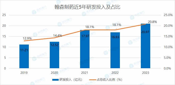 2019-2023年,,,,,,,翰森制药研发投入占比依次为12.91%、14.41%、18.05%、18.09%、20.8%,,,,,,,在立异药研发投入的资金占比丝绝不亚于跨国制药巨头。。。。。。高额的研发投入换来的是7款立异药的乐成获批上市,,,,,,,并搭建了富厚的研发管线。。。。。。据翰森财报披露,,,,,,,其现在正在举行的立异药临床试验凌驾50项,,,,,,,分属于30多个立异药产品;;;;;;2023年,,,,,,,更是新增了8个首次进入临床阶段的立异药。。。。。。