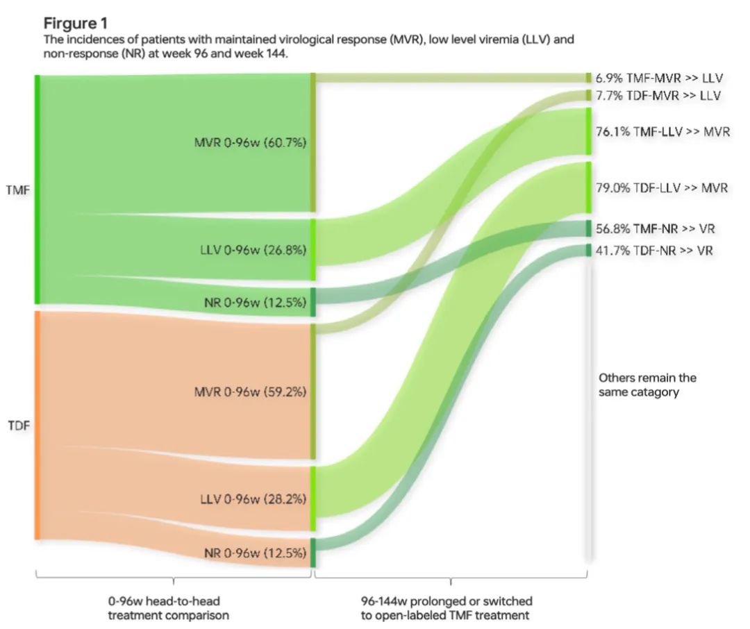 研究效果显示,,,与TDF相比,,,无论基线病毒载量崎岖(≥8 log10 IU/mL和<8 log10 IU/mL),,,TMF组与TDF组(界说为0~96周接受TDF治疗,,,96周后转换为TMF)病毒学应答率(HBV DNA<20 IU/mL)和ALT复常率均相当;;;;;;在TMF组与TDF组中,,,无论是96周前一连维持病毒应答、低病毒血症照旧无病毒学应答的患者,,,在96周密144周服用TMF后,,,第144周的病毒学应答和ALT复常率均获得改善。。。。。