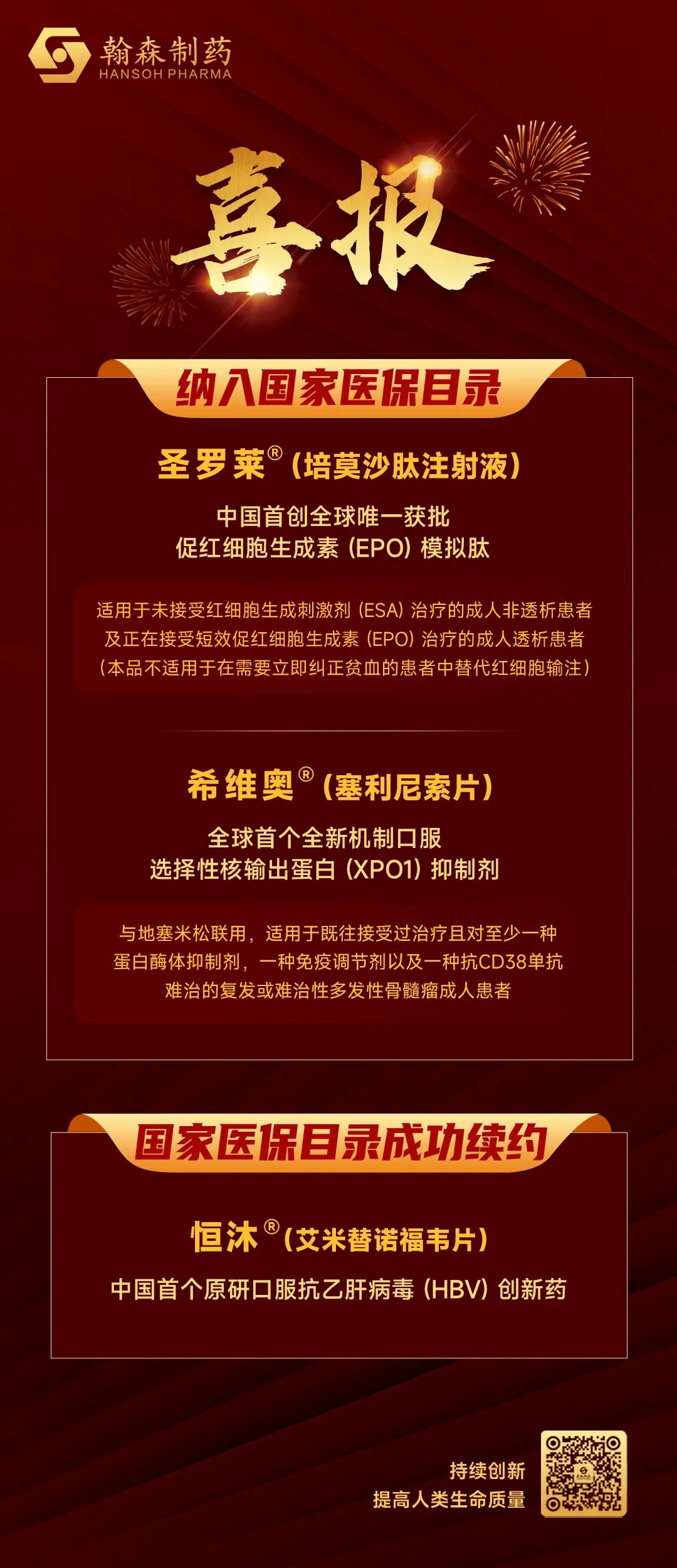 12月13日,,,,国家医保局与人力资源社会包管部宣布《国家基本医疗包管、工伤包管和生育包管药品目录(2023年)》(以下简称“国家医保目录”),,,,翰森制药自主研发的1类立异药圣罗莱?(培莫沙肽注射液)两项顺应症乐成纳入医保,,,,另一款立异药恒沐?(艾米替诺福韦片)也乐成续约。。。。。。。新版国家医保目录将于2024年1月1日起正式实验。。。。。。。至此,,,,翰森制药已上市的7款立异药所有纳入国家医保目录。。。。。。。