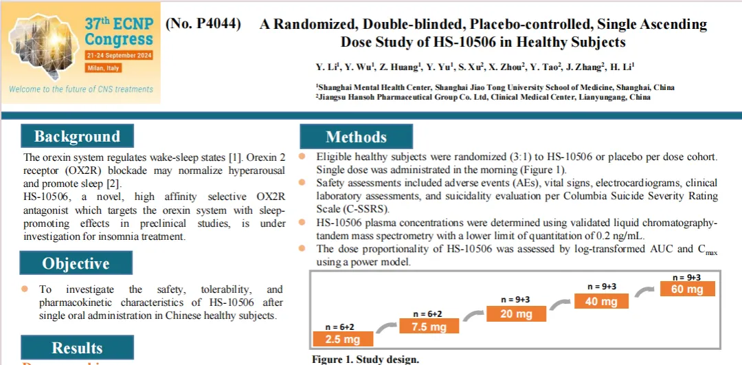 9月21- 24日,,,第37届欧洲神经精神药理学会(ECNP)大会在意大利米兰举行。。。。翰森制药原创1类新药HS-10506【一种新型的高亲和力选择性食欲素2受体(OX2R)拮抗剂】最新研究效果在会上以壁报形式宣布,,,其潜在顺应症为失眠症。。。。