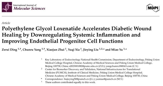 [1] Ding Z, Yang C, Zhai X, Xia Y, Liu J, Yu M. Polyethylene Glycol Loxenatide Accelerates Diabetic Wound Healing by Downregulating Systemic Inflammation and Improving Endothelial Progenitor Cell Functions. Int J Mol Sci. 2025;26(5):2367.